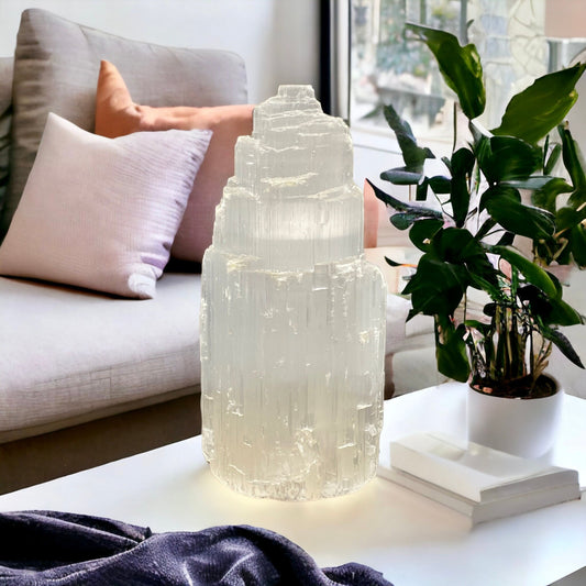 Selenite Mountain Lamp: Hand Carved Crystal Night Light with LED