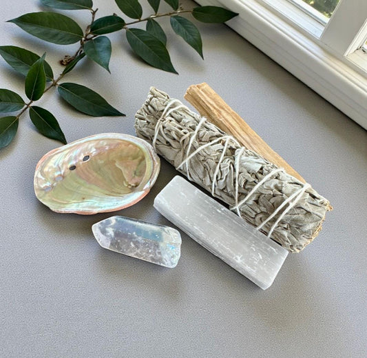 Smudge Cleansing Set – Abalone Shell • Selenite Stick • Palo Santo • Sage Bundle