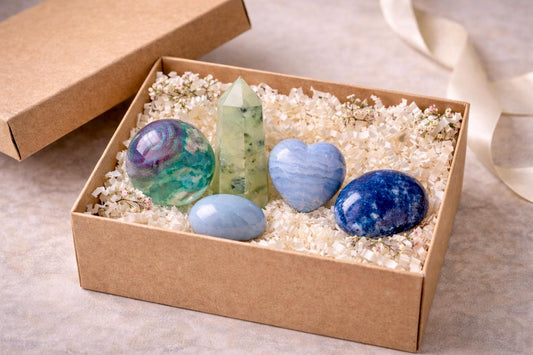 Scottish Coast Crystal Set – Fluorite Sphere, Agate Heart, Grounding Stones. Crystal Story Bundle 2.