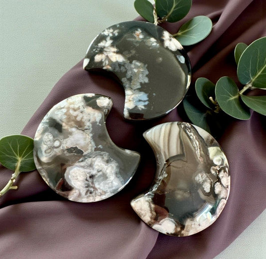 Black Flower / Blossom Agate Crescent Moon: Rare Growth Crystal Carving