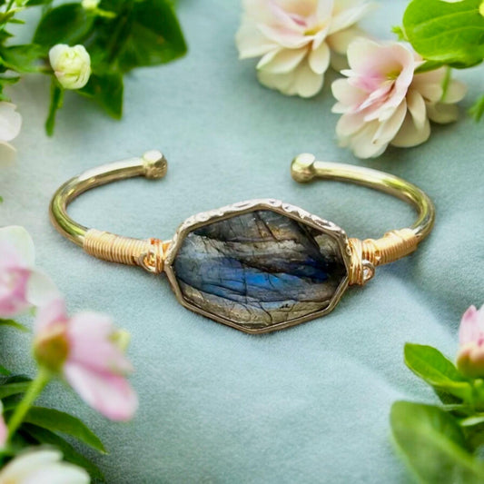 Handmade Gold Plated Labradorite Cuff Bangle: Crystal Healing Jewelry
